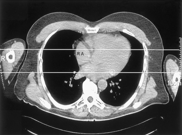 Computerised tomography illustrating the difference between the arm levels used in the present study (right arm supported at the right atrium level and left arm supported on the exam bed). R: correct arm; 50: left arm; RA: correct atrium.